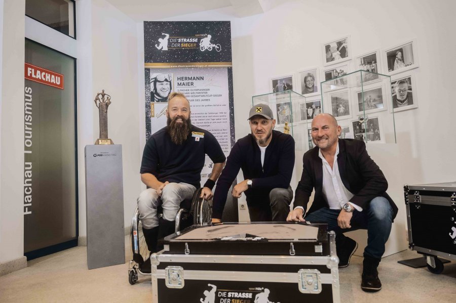 Die Hermann Maier-Gallerie bildete die Kulisse einer denkwürdigen Begebenheit: Franz Russegger und sein Team von Legend Media bezogen Stellung im Eingangsbereich der Zentrale von Flachau Tourismus im Ortskern, um Hermann in Beton zu gießen...